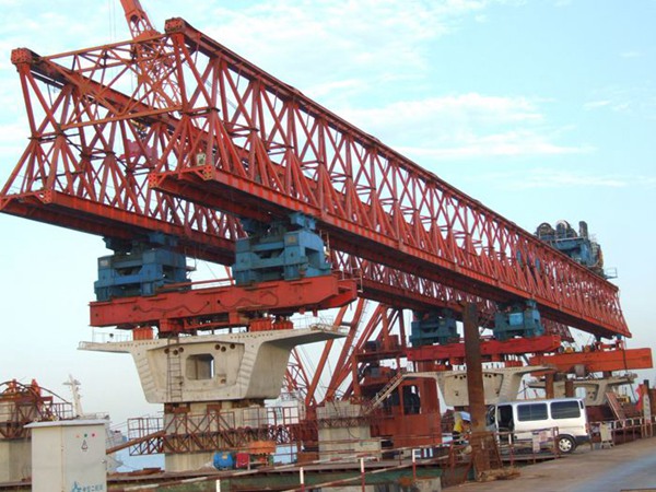 河南周口铁路架桥机厂家,架桥机属于起重机特种设备,它的用途是将梁场预制好的箱梁或T梁放置到桥墩上去。架桥机上横梁由型钢焊接横梁,它安装在两列主梁的后端上,横梁的两端通过可调法兰和旋转支座与主梁连接,架设斜桥或曲桥时,可自身调节角度。架桥机提升小车由纵移轮箱、旋转支座、担梁、横移轮箱、卷扬机及滑轮组等组成,功能是提升、运送和架设预制梁。轮箱上的电动机通过摆线针轮减速机及齿轮组将动力传递给车轮,实现纵移轮箱在主梁上纵移运行及横移轮沿担梁横向运行。通过调整旋转支座可以得到需要的角度满足斜梁和曲桥的架设。